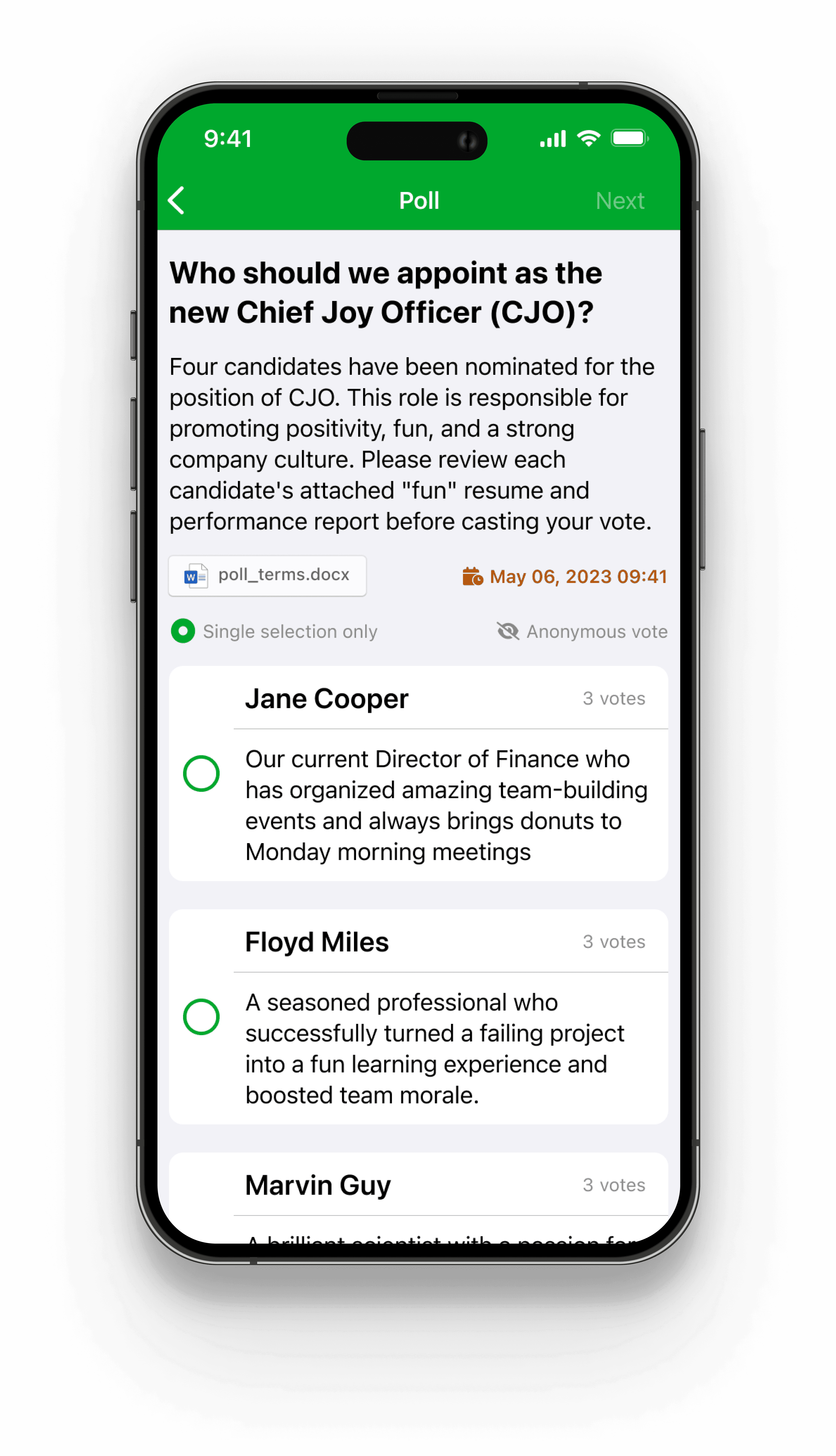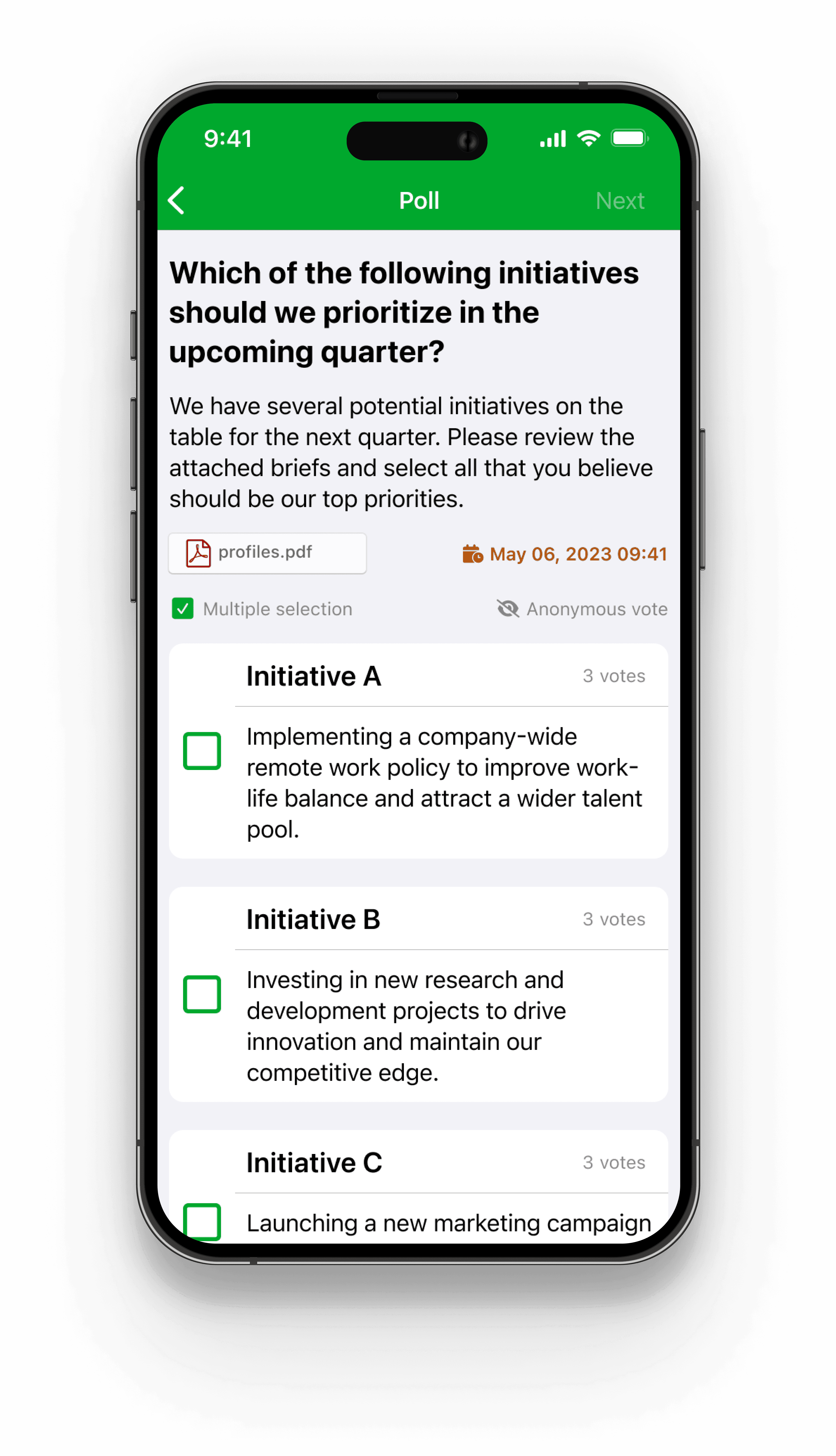 Polling is essential for board members to collaborate and vote on key decisions, but the feature was previously limited to the web app, creating a frustrating experience on mobile. To solve this, we introduced a dedicated Poll feature for iOS, enabling users to vote quickly, securely, and seamlessly within the app.